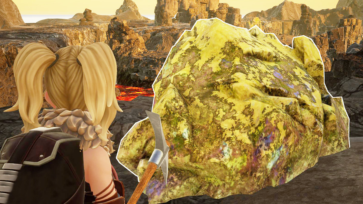 - You will eventually find a circular rock area surrounded by lava (see the map above). This spot has five Sulfur rocks that are grouped together.