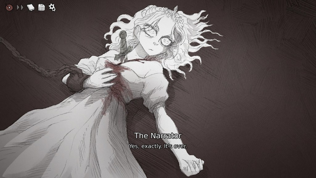 There are only three characters in Slay the Princess: the Princess, the Narrator, and you. The Princess changes based on things you say, how you treat her, and how you react to her. Sometimes you go past the point of no return, and there is no way to undo the things you have done, but that is the point. While the Princess and you wrestle over and over in ways that can range from sweet, to slaughterous, to sad, it truly is a love story.