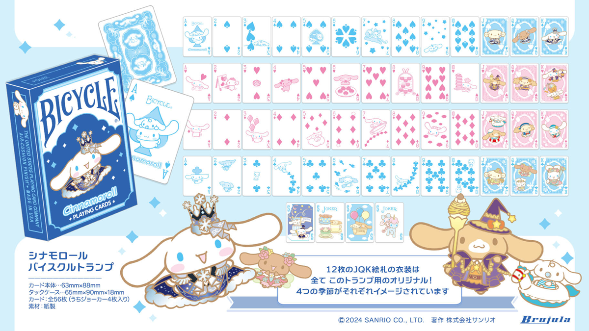 Sanrio announced a new deck of cards starring Cinnamoroll released in collaboration with the popular Bicycle Playing Cards brand. The deck costs 1,980 yen (~$12.98) and is now available for purchase in Japan from the Brujula online store as well as other retailers.