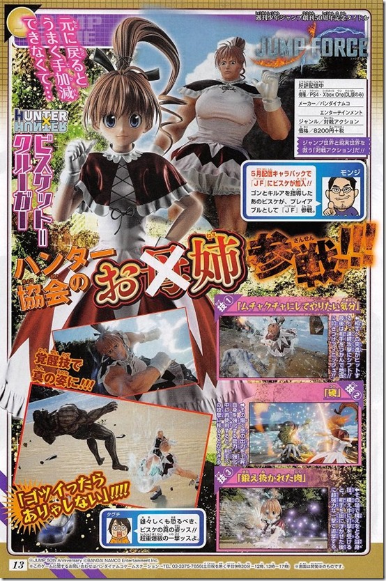 Hunter x Hunter’s Biscuit Krueger says she prefers her younger form to throw off enemies, but she actually just hates her original bulky form, which we’ll get to see as an Awaken form in Jump Force, according to this week’s issue of Jump magazine. [Thanks, Ryokutya2089.] Update: Here’s a look at a scan via @pkjd8I8: