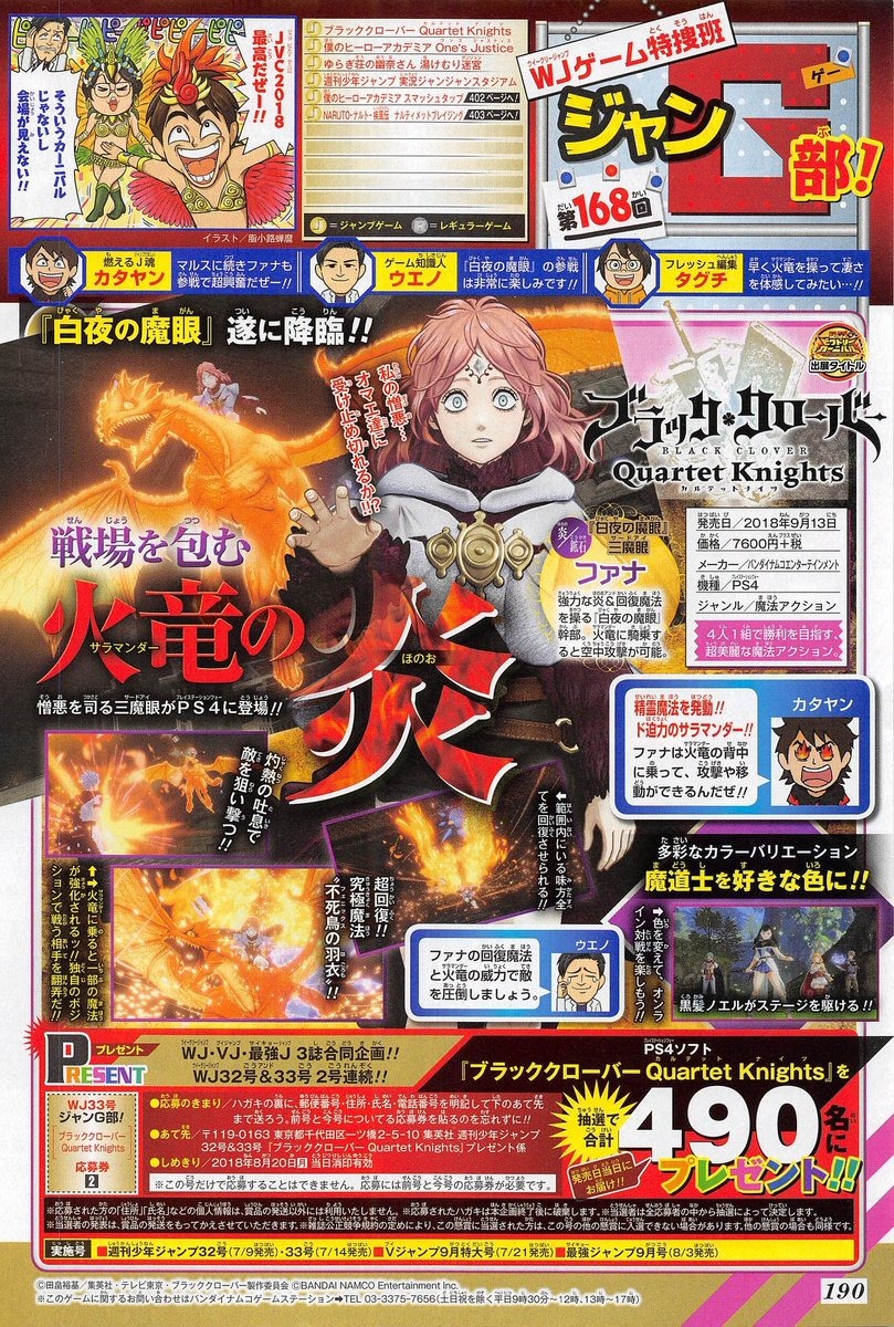 Bandai Namco revealed in this week’s issue of Jump magazine that the upcoming 4v4 magic brawler Black Clover: Quartet Knights will feature Fana the rogue mage from Diamond Kingdom as a playable character. [Thanks, @YonkouProd.] When Fana mounts on Salamander, some of her magic becomes extra powerful, and she’s able to attack using Salamander’s Breath attacks from above. Fana can also use the Fire healing Magic, Phoenix Feathers Robe for super recovery. Black Clover: Quartet Knights releases on PlayStation 4 and PC in North America and Europe on September 14, 2018. The game releases in Japan on September 13, 2018 for PlayStation 4. Check out our previous report for a look at the latest trailer featuring Mars and several other characters.