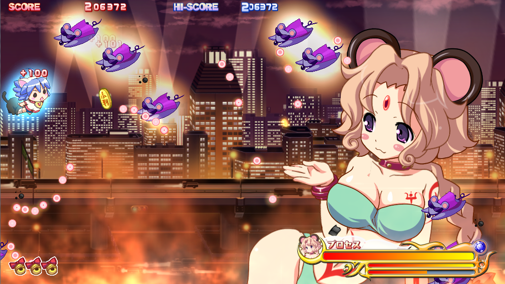 Go Go Burunyanman Ecstasy!!!’s action happens due to a cat believing that mice have stolen all the tuna, so she turns into a flying, shooting girl to get it back. Players can join her on this journey of justice across several difficulty levels and modes, striving for high scores through combos to get onto world leaderboards.