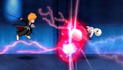 All of this fighting takes place in 2D, but Bleach: Soul Carnival has a 3D map. Flat planes are interconnected like Valkyrie Profile where you can walk into or out of backgrounds to reach other areas. This prevents the stages in Bleach: Soul Carnival from being a straightforward stroll from the left side of the screen to the right. In one of the early levels you need to escape a moving wall closing in from the left side of the screen. You can escape by running to the right, but there are other paths to take if you’re quick enough to squeeze into them. Other levels, like boss fights, remind me of Odin Sphere since you’re caught running on the edge of a 2D circle.