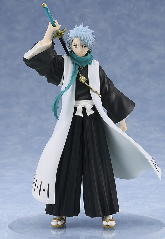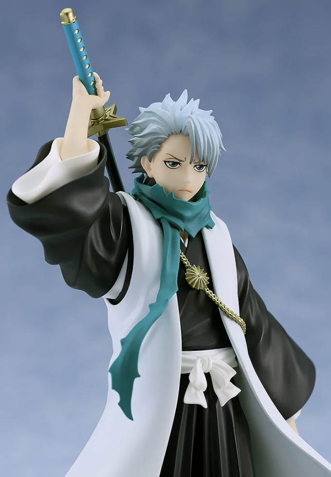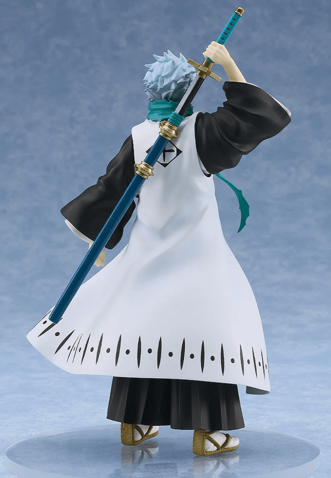 This version of Hitsugaya is based on his Bleach: Thousand-Year Blood War appearance. As this is over a year after we first meet him, he looks older than he does at the start of the series. Most notably, his hair is shorter and he wears a scarf. The pose makes it look like he’s about to draw his Zanpakuto Hyorinmaru, which was on his back.