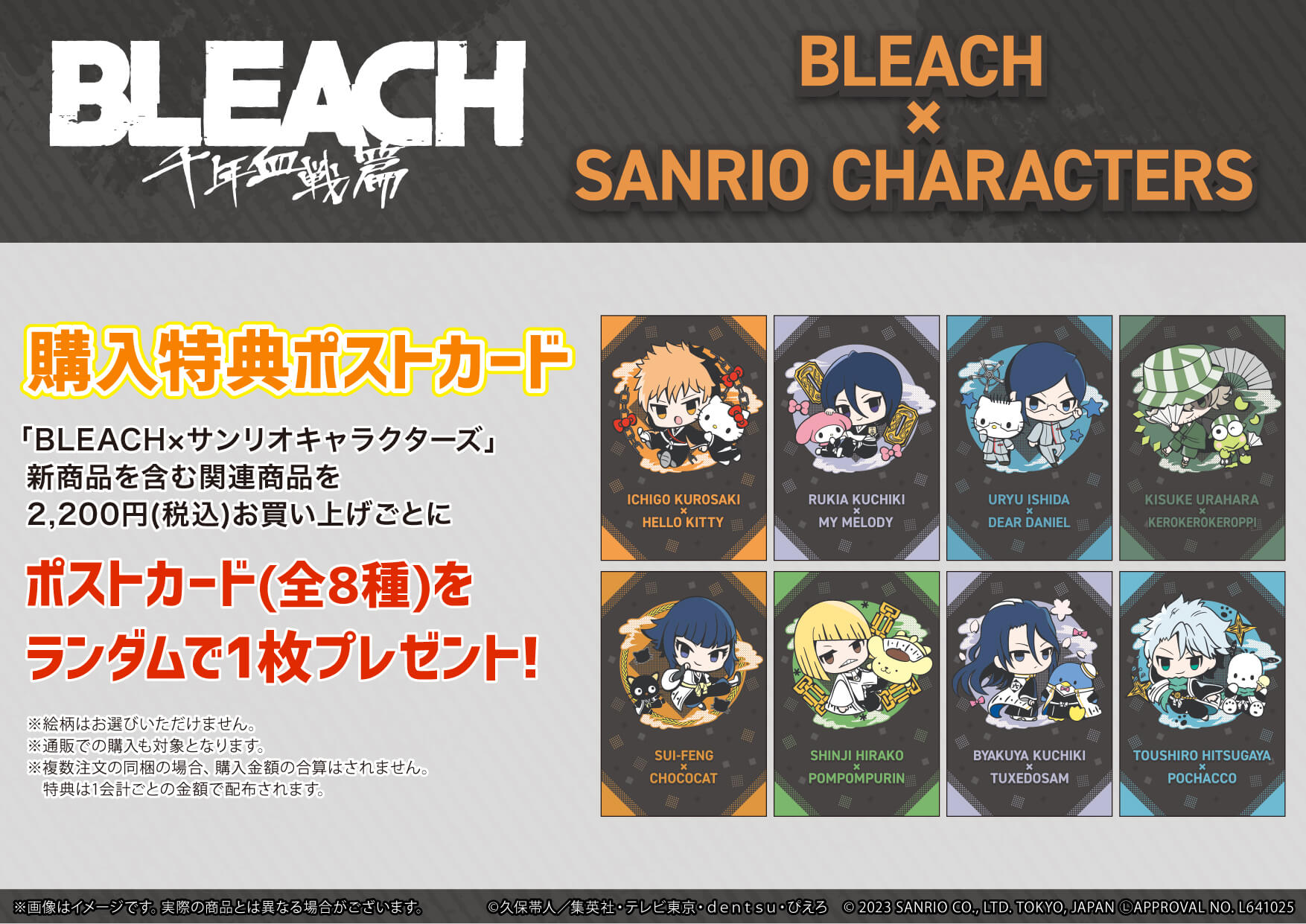 Purchases of over 2,200 yen will include one of eight different post cards available as well. You can take a detailed look at the items included in the new Bleach and Sanrio character collaboration in the gallery below.