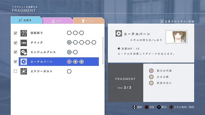 Hinako and the other Reflectors will need to be powered up in order to face the Progenitors. You’ll do that by using crystallized feelings, called “Fragments,” which you can equip to increase attack and defense. Fragments come in all kinds of effects and found in the Other World.