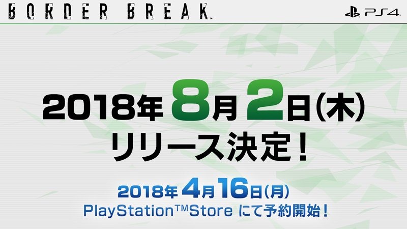 During Sega Fes 2018, Sega announced that Border Break for PS4 will launch August 2, 2018, as well as Starter and Special Packs for the free-to-play game.