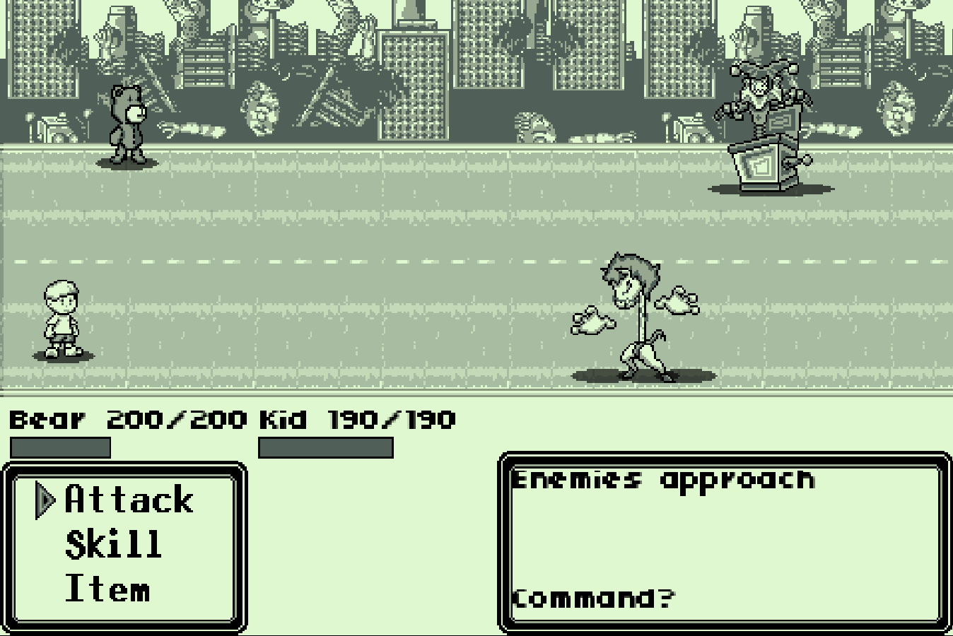 The boy will have to cross twenty levels, steadily finding the truth of this decaying, Game Boy-styled world as he fights his way to his missing mother. He’ll have to platform over yawning pits, but should he make contact with an enemy while jumping around, he’ll have to fight them in turn-based combat.