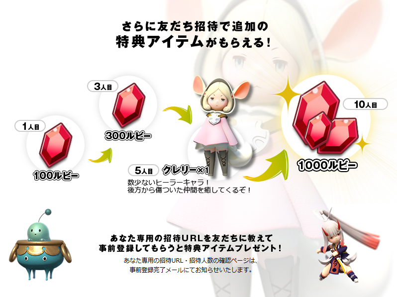 You can also get more bonuses by getting friends to use your URL and pre-register as well. The bonuses include rubies, which seems like the game’s currency, and one “Clery” character. They say that there aren’t many healers, so getting one could help out nicely. Little Noah launches this winter in Japan for Android and iOS devices.