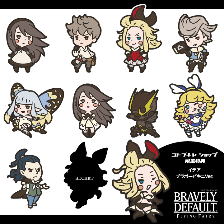 Ten characters are in the Bravely Default collection – Agnes, Tiz, Edea, Ringabel, Airy, Agnes (in prayer clothes), Alternis Dim, Praline a la Mode, Lester DeRosso, and a secret version of Agnes in another costume. Kotobukiya is selling a ten pack with a bonus strap of Edea in the Bravo Bikini for 6,480 yen. The Bravely Default rubber straps will be available in February 2015.