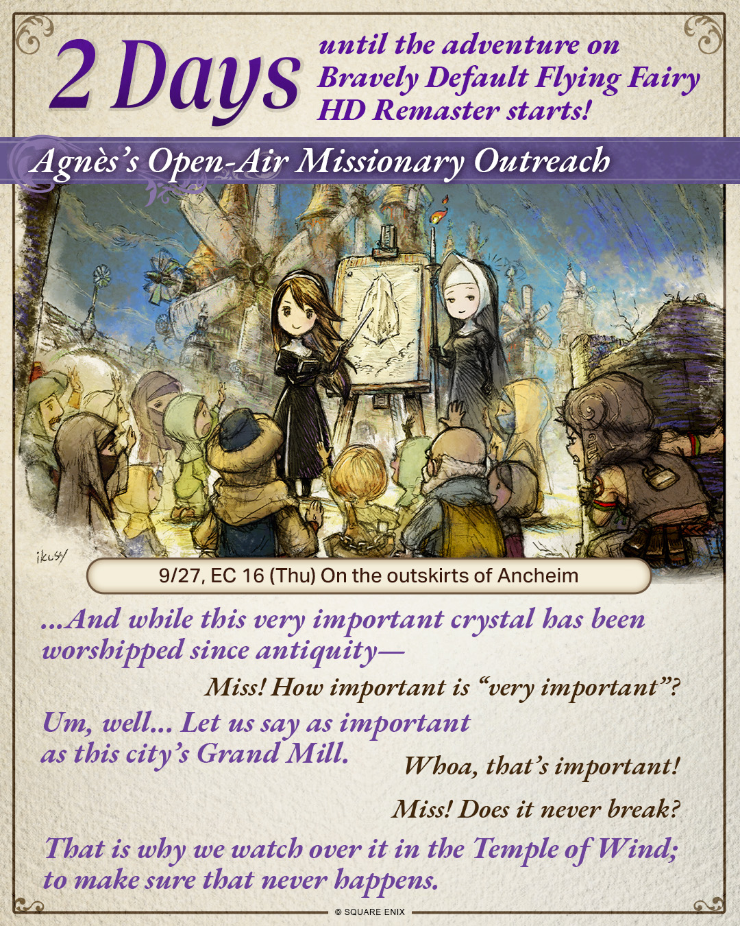 The first image involved a peek at Agnes before she headed out on her mission for the Crystal Orthodoxy in Bravely Default. She’s the Wind Vestal devoted to that elemental crystal. As shown in her prequel art and story, she’s working alongside another nun from the Temple of Wind to teach people in Ancheim about the importance of crystals.