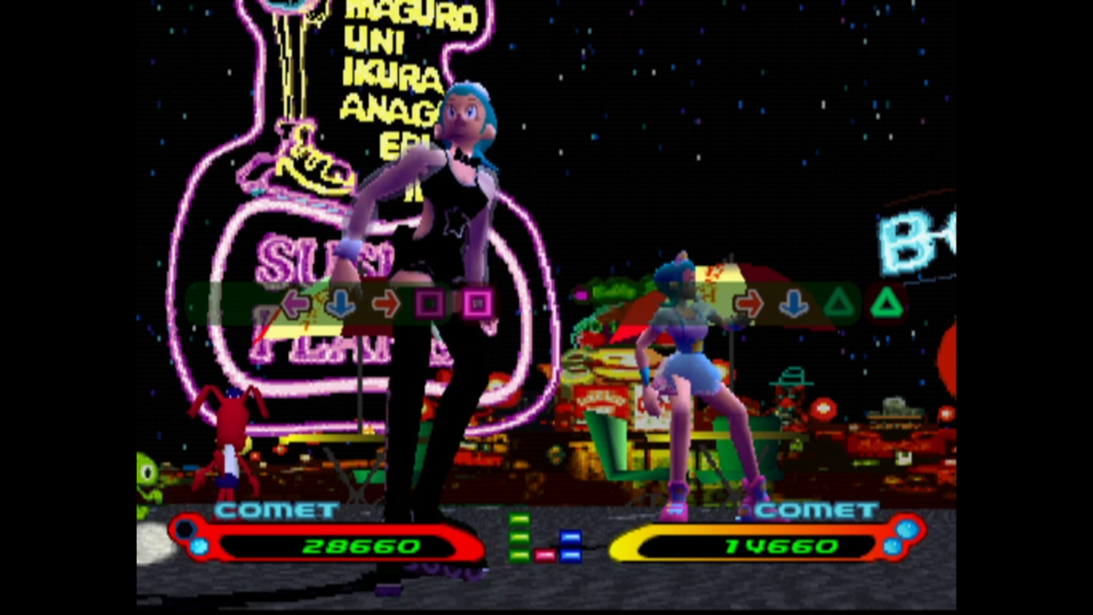 To be honest, there are only about twelve different stages and tracks you can listen to in the game. So it makes sense that they’re good, since the developers expected the players to listen to these tracks ad nauseam. Its 1990s rhythm game compatriot of Dance Dance Revolution also had about that much, so I guess it was just the norm back in the day. At least Dance Dance Revolution let you pick what songs you want to listen to or play to, though! I hated having to go up against Kelly, because her song is so slow and it always feels like it takes forever.