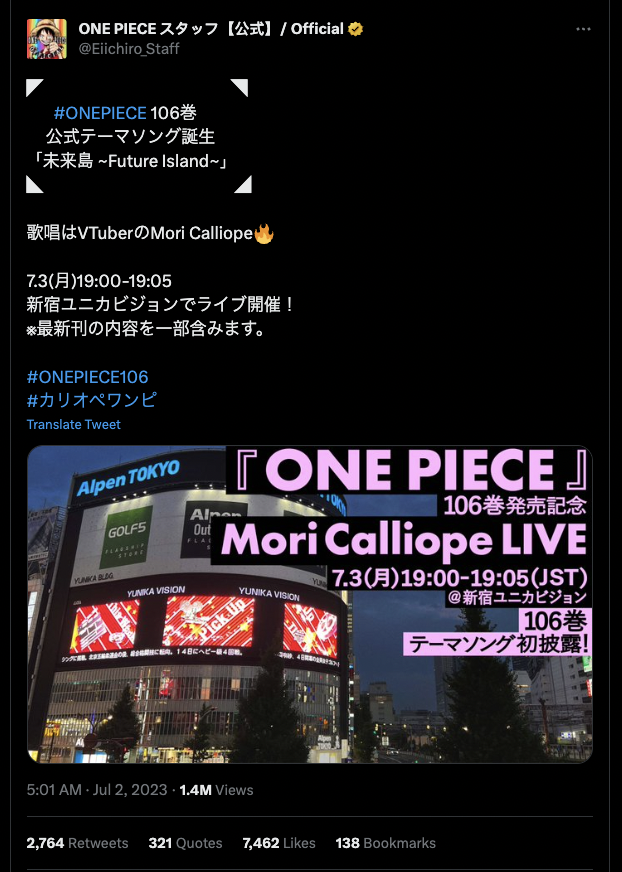 At 7pm JST on July 3, 2023, Calliope Mori will perform the One Piece manga volume 106 theme song “Future Island.” It will take place at the Yunika Vision in Shinjuku in Tokyo, Japan. That means those outside Japan should be able to see it and learn more at about 3am PT/6am ET on July 3, 2023. First, here is Calliope Mori’s teaser for the One Piece theme song performance. It features a Jolly Roger design from the series, only with her own hair, crown, and scythe portraited above the date of the performance.