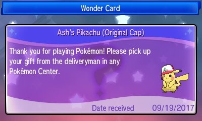 originalcappikachuevent A new distribution has started for Pokémon Sun and Pokémon Moon to celebrate the upcoming release of the Pokémon: I Choose You! movie. By entering the code PIKACHU20 into your game via Mystery Gift, you will obtain a special Pikachu wearing Ash’s original hat from the Pokémon anime and movies. The Pikachu will also enter your game holding the special Z-Crystal Pikashunium Z. [Thanks, Serebii.]   However, if you do decide to pick up this Pikachu, please note that none of the other hat-wearing Pikachus that will be released in the future will be obtainable, as players are only permitted one special Pikachu.   Pokémon Sun and Pokémon Moon are available for the Nintendo 3DS.