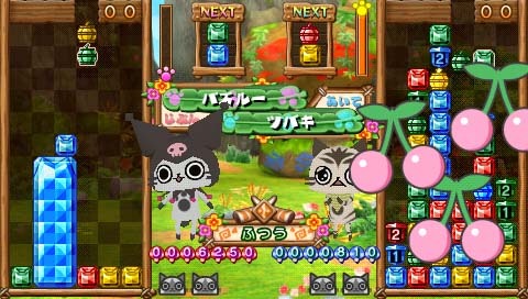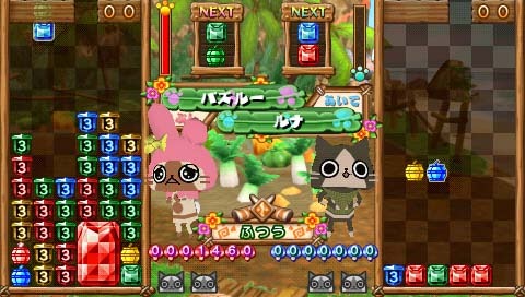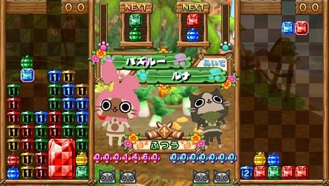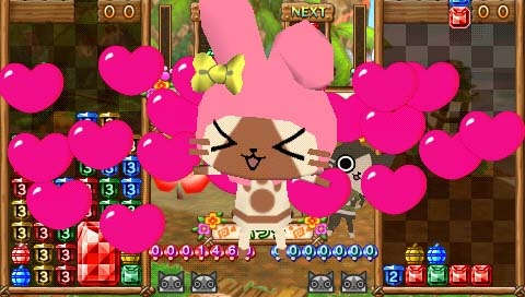 Felyne de Puzzle is coming to PSP this Thursday and it looks a lot like Super Puzzle Fighter 2. Players stack gems on top of each other and use explosive barrels to send pieces over to the other player.