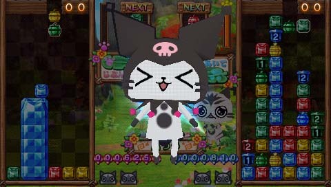 Capcom added a few surprises for Monster Hunter fans. You can earn a My Melody costume and Kuromi costume parts. Torostation mascots Toro and Kuro are also playable characters in Felyne de Puzzle. The PSP game will retail at a budget price – 2,700 yen ($34) for a digital download and 2,900 yen ($37) for a packaged copy.