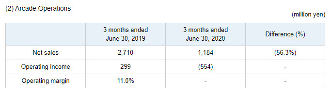 The Amusement business segment also saw a big drop because of the closures and suspended operations due to COVID-19. Net sales dropped by 19.4% from the same term in the previous fiscal year. Operating income here was 71 million yen, down 46.7% from the previous fiscal year.