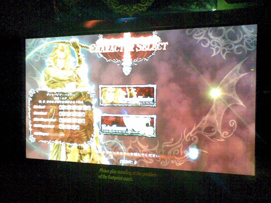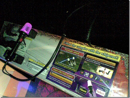 Fortune brought me to the unreleased Castlevania arcade game. And while playing the game someone else was able to snap a few camera phone quality pictures from the inside so you can see more than a lovely cabinet. When you start Castlevania: The Arcade you get to pick one of two characters: a generic Vampire Hunter and a Lady Shooter. We’re hunting vampires so I went for the Vampire Hunter. Two people can play Castlevania: The Arcade so you can have one of each character for balance purposes.