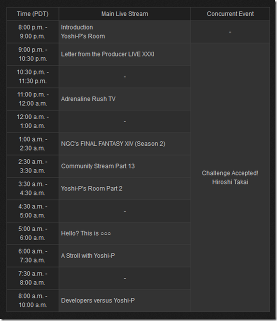 To celebrate Final Fantasy XIV: A Realm Reborn’s third anniversary, Square Enix will be broadcasting a special 14-hour live stream event featuring the game’s development team. The live stream will begin at 8:00 pm (PDT) and many segments will be featured, including the Letter from the Producer Live XXXI, which will give us a glimpse into the game’s upcoming patch 3.4. Here’s a look at the entire broadcast schedule, from Final Fantasy XIV’s official Lodestone: