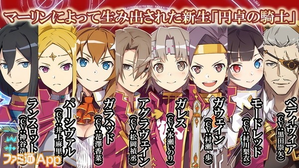 (from left to right) Lancelot (CV: Kouji Kamiya) Percival (CV: Marina Inoue) Galahad (CV: Kana Hanazawa) Agravain (CV: Yoshitsugu Matsuoka) Gaheris (CV: Inori Minase) Gawain (CV: Rie Murakawa) Bedivere (CV: Takaya Kuroda)