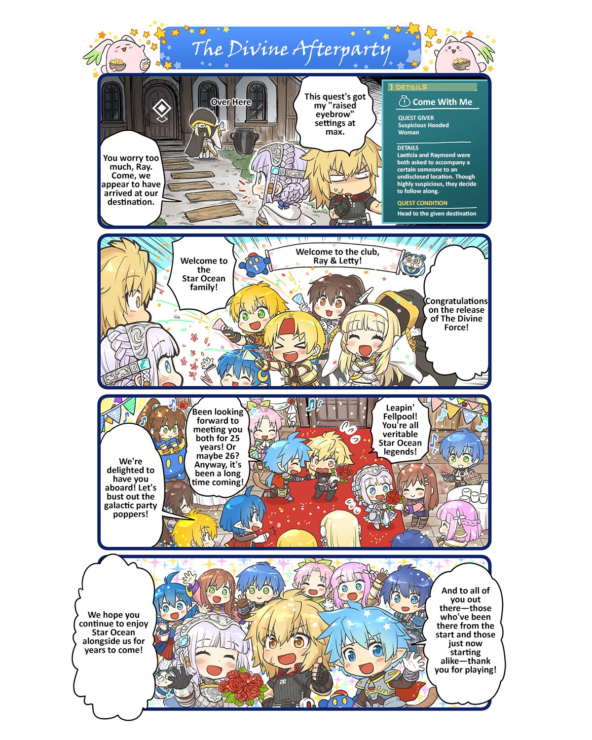 Square Enix’s run of official Star Ocean: The Divine Force mini manga releases came to an end. It uploaded the tenth and final installment to the official Twitter account. The previous nine comics focused on characters from the latest entry. Each one was essentially a short gag manga with chibi versions of the cast. However, the last one brings in characters from across the Star Ocean universe to meet The Divine Force heroes Laeticia Aucerius and Raymond Lawrence. A number of major characters appear in the first Star Ocean: The Divine Force mini manga panel. For example, Edge Maverick (SO4), Rena Lanford (SO2), Claude C. Kenny (SO2), Reimi Saionji (SO4) and Evelysse (Anamnesis) appear in the first panel. In the final one, the rest show up. In the back row, there is Rena, Sophia Esteed (SO3), Fayt Leingod (SO3), Millie Chliette (SO1), Miki Sauvester (SO5), and Fidel Camuze (SO5). In the front row, Laeticia and Ray are next to Roddick Farrence (SO1). Here’s the full comic: