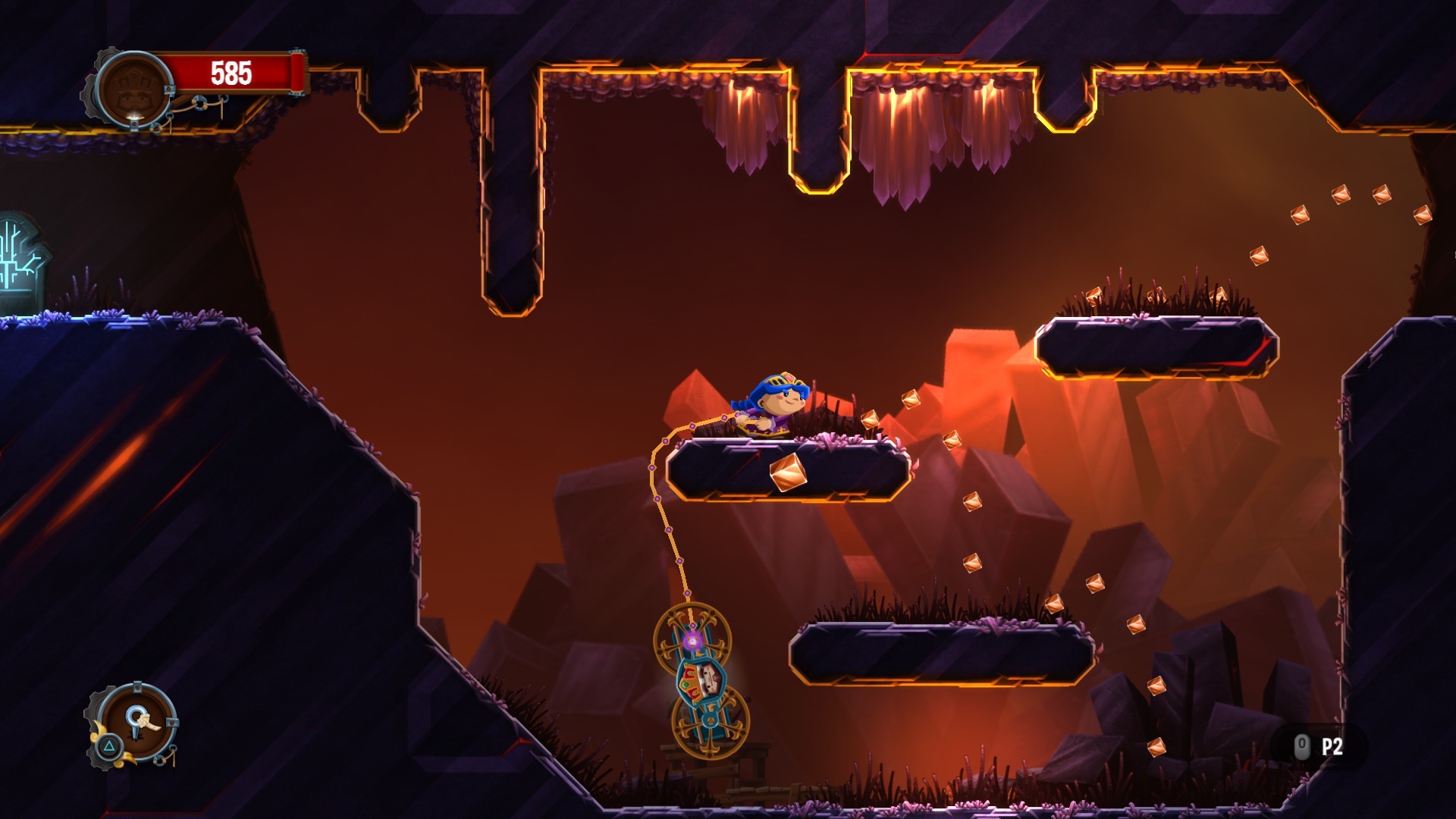 I realize that the pitch “It’s like a 2D platformer, but you need to drag a cart along with you everywhere!” probably inspires more dread than enthusiasm, escort quests have a bit of a naff reputation. In this case trepidations are unfounded. Figuring out how to move the cart through the levels is the entire point. Chariot recalls Trine more than Mario Bros., it’s a physics manipulation game at heart with deceptive resemblance to 2D platforming. Challenging sequences of tricky jumps are not the name of the game. The mechanics are simple. You can tether yourself to the cart to pull it, you can push the cart, you can ride on top the cart, and you can dig in to any solid ground to prevent the weight of the cart from dragging you down should it be dangling off a cliff. You can reel your tether in and let slack back out with the two left side shoulder buttons. The mechanics are simple, but their applications are not. Getting the casket from point A to point B requires stretching these functions to their limits. Sometimes you need to drag the casket off a ledge with you so that your partner can catch the two of you as you go by, sometimes you’ll need to use the chariot as a temporary platform while a player suspends it with their tether. Sometimes you’re going to need to swing the chariot back and forth with your partner hanging off his tether at the opposite end so that he can build momentum and jump off at the apex of his swing like Indiana Jones.