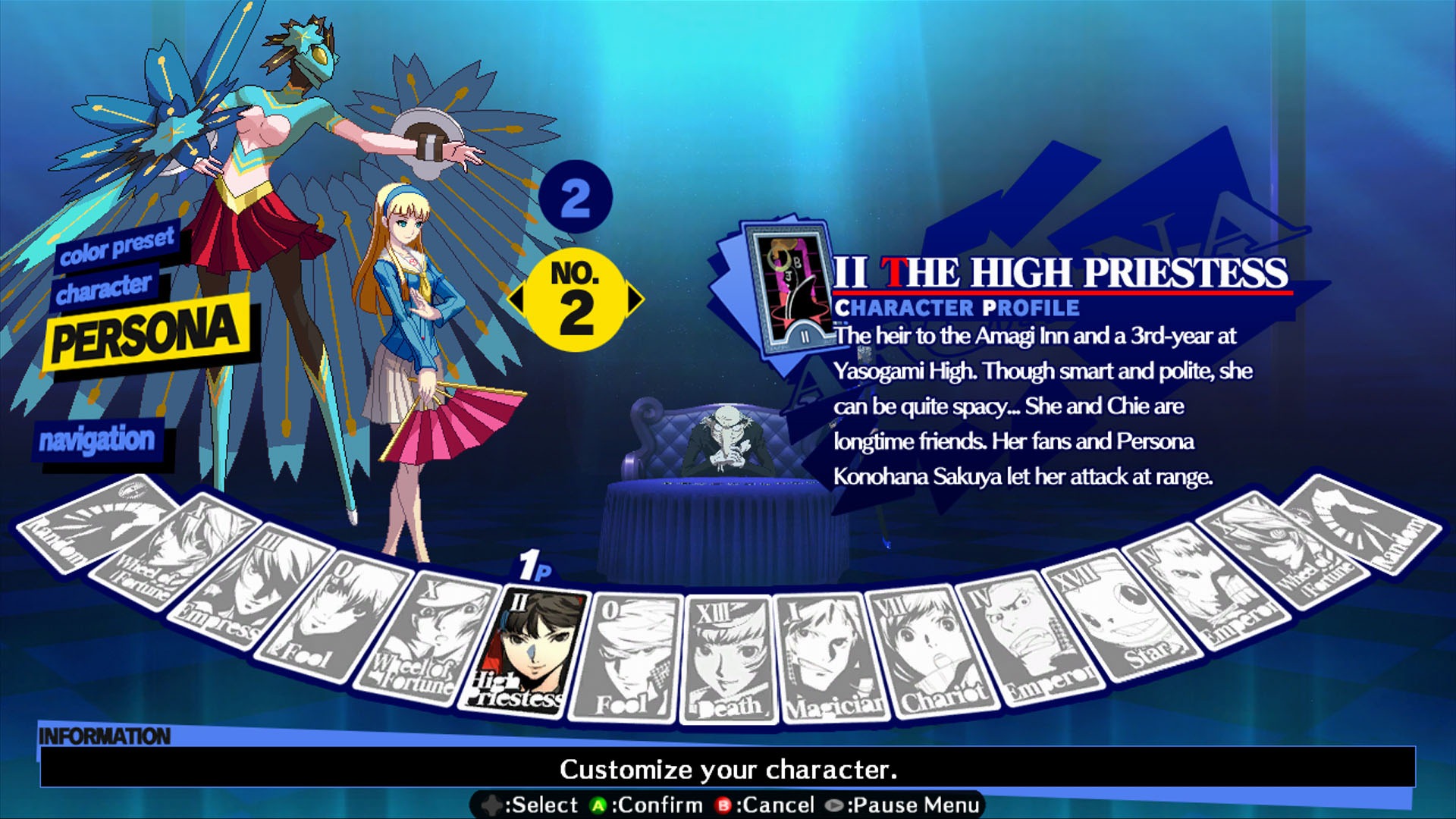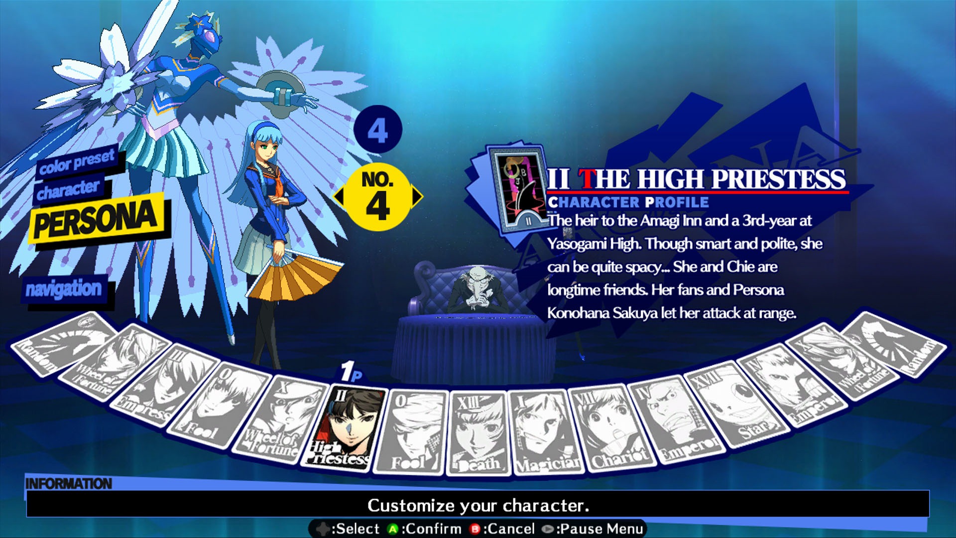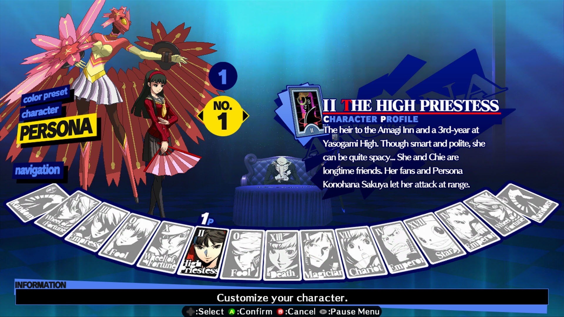 Yukiko Amagi has been studying to be a chef when the events of Persona 4: Arena take place. She hears rumours of the Midnight Channel’s return and re-enters the TV world, where she runs into new character, Labrys. Today, Atlus USA sent out a few screens of Yukiko, showing off her various costume colours in the game: