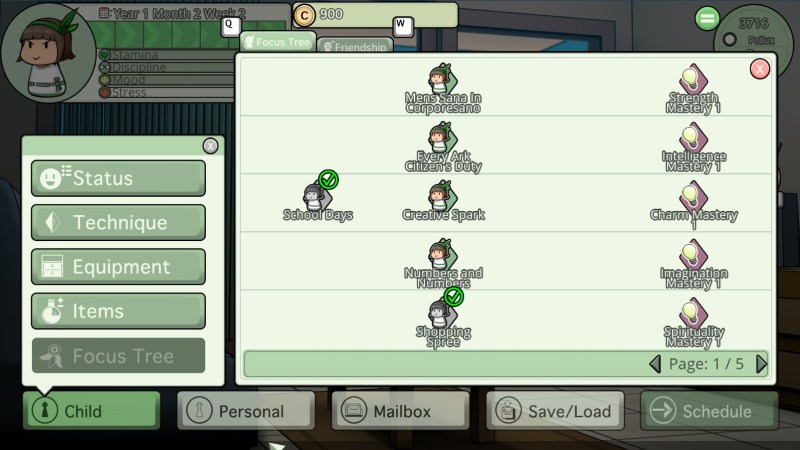 Then, there’s the Focus Tree. This is a way to gauge exactly what you are doing and be rewarded for your efforts. Think of it as an achievement system. As you have Ciel perform certain actions, like shop, attend certain classes, get skills to certain levels, or befriend certain characters, you’ll get a check mark on nodes on the tree. It is a visual way of seeing when you are or aren’t doing well. It can also mean tangible rewards. For example, the first one people will earn is a Cheesecake for sending Ciel to Public School five times. This teaches you about consumable items, which can be used to boost Ciel’s stamina and such during the week, while also getting you comfortable with this system. The more you do, the more you earn and see how she’s progressing.