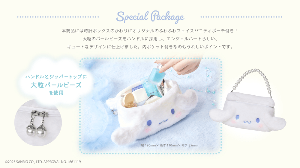 Sanrio is collaborating with the Japanese watch brand Angel Heart to release a heavenly Cinnamoroll watch. Instead of coming in a box like a normal watch, it’ll come in a vanity pouch that looks like Cinnamoroll’s head, which you can reuse for small items like make-up or keys. It is shipping outside of Japan.