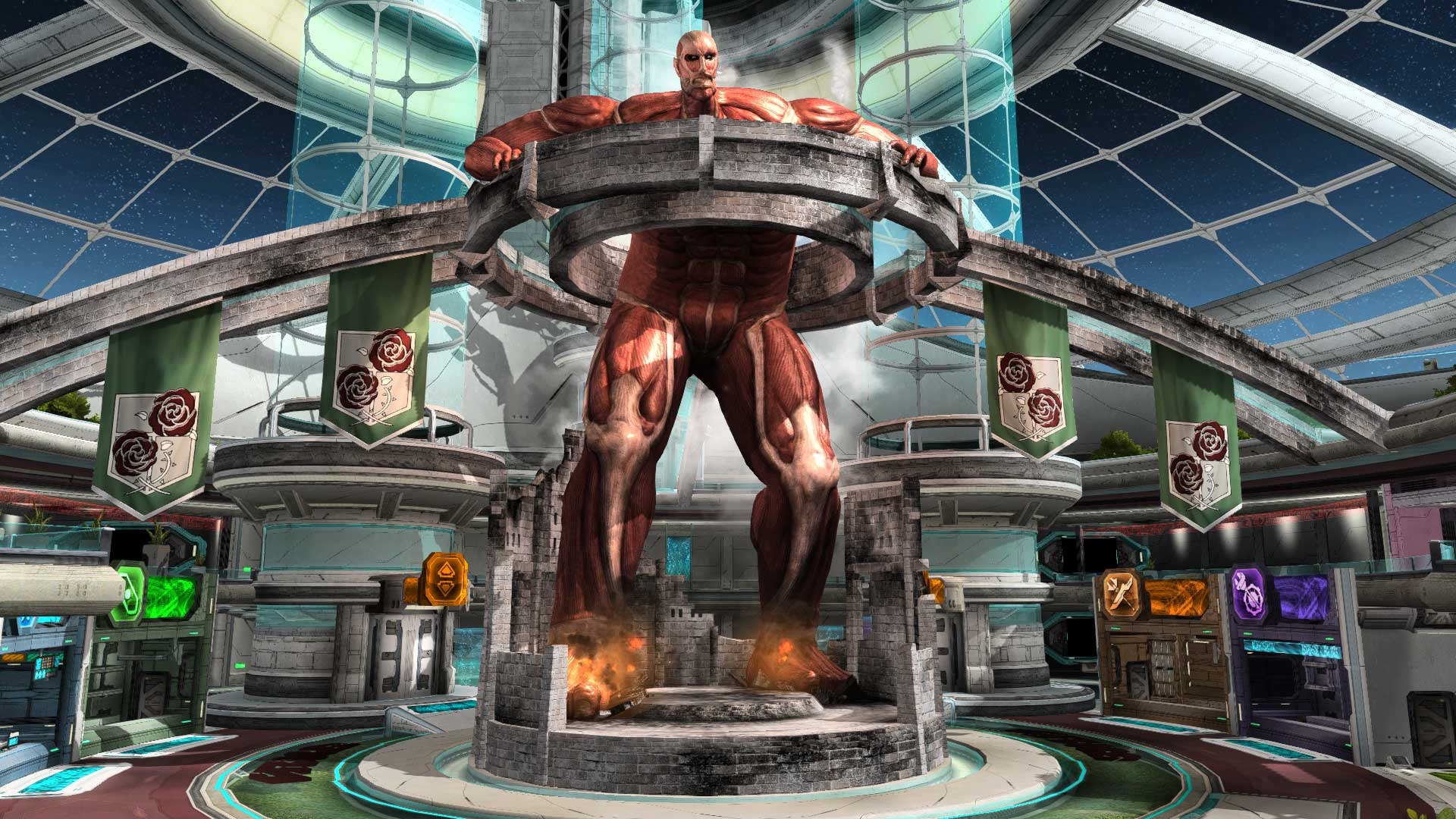 Here’s a look at the Colossal Titan just hanging out in the middle of the game’s lobby. Players won’t have to worry about being crushed, tackled, or eaten by it; but I wouldn’t get too close to it, just in case it decides to wreak havoc. There will also be Attack on Titan posters and more scattered around town.