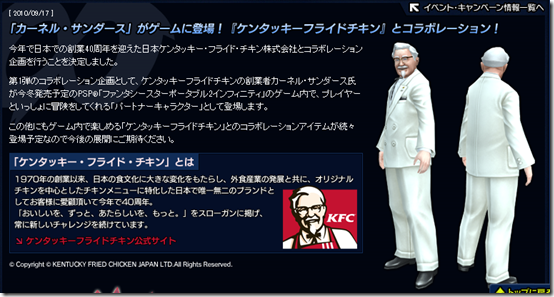 The KFC founder will be in Phantasy Star Portable 2 Infinity as a partner character you can adventure with. Other Kentucky Fried Chicken crossovers will be revealed at a later date. Don’t look too shocked. Sega and KFC parent company Yum Brands also collaborated with Phantasy Star Portable 2 by adding Pizza Hut items into the PSP game.