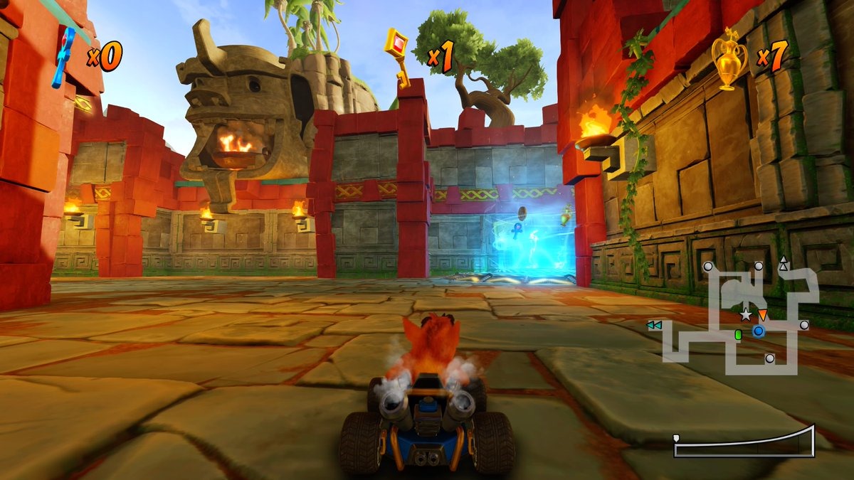 Each area of the world comprises of four races, as well as a boss race, before the player is allowed to progress onwards. While the races for the trophies aren’t anything special other than the fact that you fail if you don’t get first place, the bosses are something else altogether. In these 1v1 races, Crash must face off against quick bosses who will each spam a different item, meaning that these are unfair fights from the get-go. I had to race extra careful against the likes of Ripper Roo, Papu Papu, and more, but fortunately, you’ll unlock the character for multiplayer as well once you beat them.