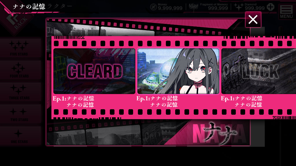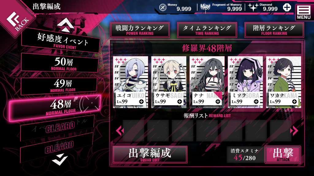 Battle: Enter dungeons and progress the main story. On some floors, you can bond with the Criminal Girls. Enemies in the dungeon will drop materials you can refine your weapons with. Memory: Beating the boss of each floor will unlock memory fragments, which you can spend to unlock the girl’s memories of their crimes committed in the real world. When you unlock all of them, the girl will… Equipment & Weapon: Equip weapons and items found in the Shura dungeons. Shop: Equipment and item gacha. (Some can be earned via rewards.) Research: Character gacha. Movie: Every hour you can watch a CM to earn points that can be spent in the shop. Daily Reward: Daily quests. Battle Prep Screen