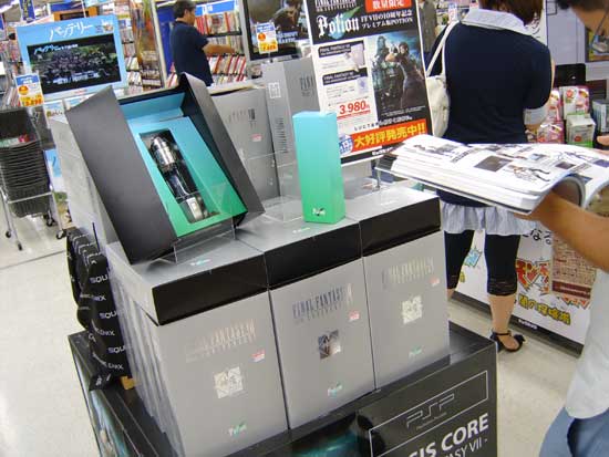 Square-Enix is not taking any chances with Crisis Core: Final Fantasy VII. Billboard sized ads are outside when you wait for a train and when you get on the train a silent LCD screen rotates through a Crisis Core ad. Stores are giving Crisis Core premium real estate too with posters and in Shinjuku a stand right when you enter the video game section of Bic Camera. Along with shilling Crisis Core the guide, Final Fantasy VII International and boxes of the 40th anniversary potion are piled up. The only item they are missing are the limited edition Crisis Core PSPs, which sold out earlier this morning.