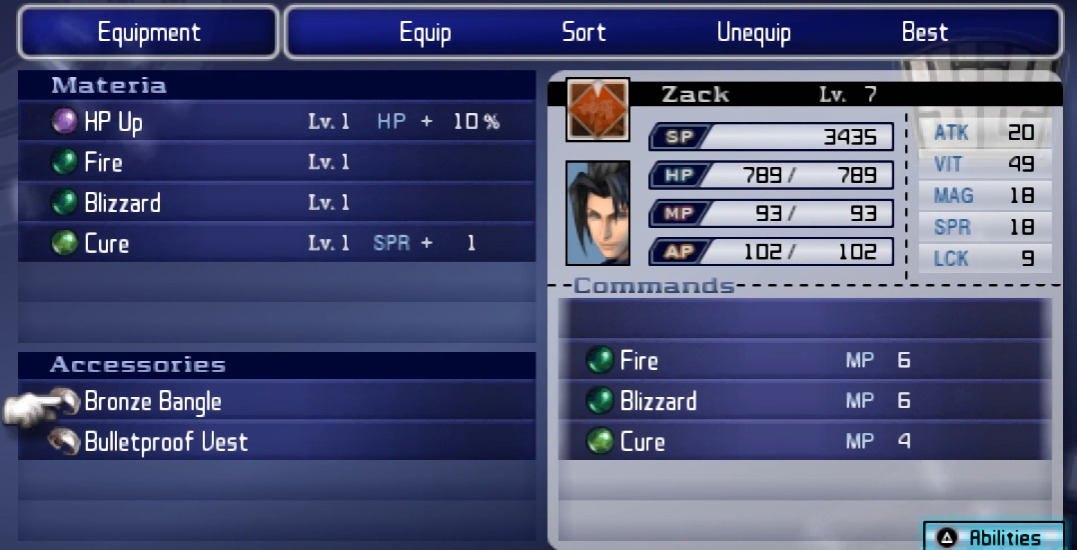 The new Crisis Core FFVII Reunion user interface takes more directly after the aesthetic style and layout used in Final Fantasy VII Remake. It also takes advantage of the extra screen space afforded by home consoles. Artwork of the character is more prominent too. One holdover is the visible Shinra company logo, though, as a reminder of the context of the adventure. Players can also sort and filter materia by their color and type, as well as see their statistical gains at a glance. Check out a screenshot from the PSP version’s menu below, for comparison.