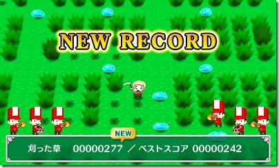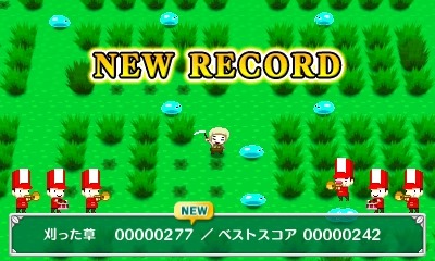 It’s also the perfect opportunity to test your skills. The longer you survive, the thicker the grass grows and faster the slimes move in the aisles. You have to adapt. You learn to temper Kusakari’s dashes. You realize the importance of consulting the map, as it will show the blue grass patches when they randomly appear. Yet, you also learn not to over-rely on the lower screen and it’s information, since you have to keep an eye on Kusakari’s immediate environment to survive.