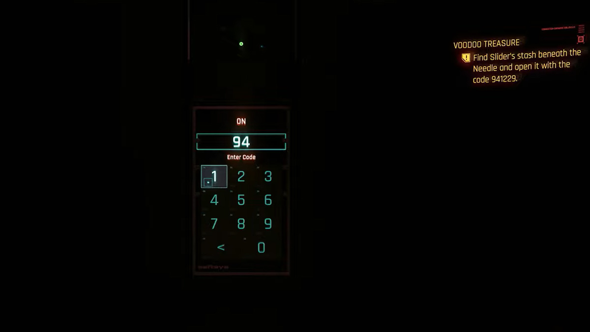 You will then find a container with a keylock pad on it that is directly to the left of the BD Shack store. You will now need to enter the passcode that you received from the “I’ve Seen That Face Before” quest that you completed before this. Enter the code “941229” to open Slider’s Stash, which has the Second Installment item and 8,000 Eurodollars inside.