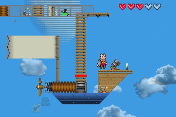 Airship Q is a side-scrolling, 2D sandbox game where players have been transformed into a cat-being. In order to return to normal and return to Earth, you’ll need to find the mysterious Empress. How you get to her though and where she is? Who knows! But to do so you’ll be able to craft and pilot an actual flying boat/ship/plane. Similar to Terraria, Starbound and Minecraft (which the devs state were inspirations), you’ll be able to mine and dig and plant and craft your way to better gear and airship parts as necessary by scrounging the randomly-generated world’s resources. Enemies will also abound whom you’ll need to fight off, including undead sky pirates who’ll look to sink your battleship.