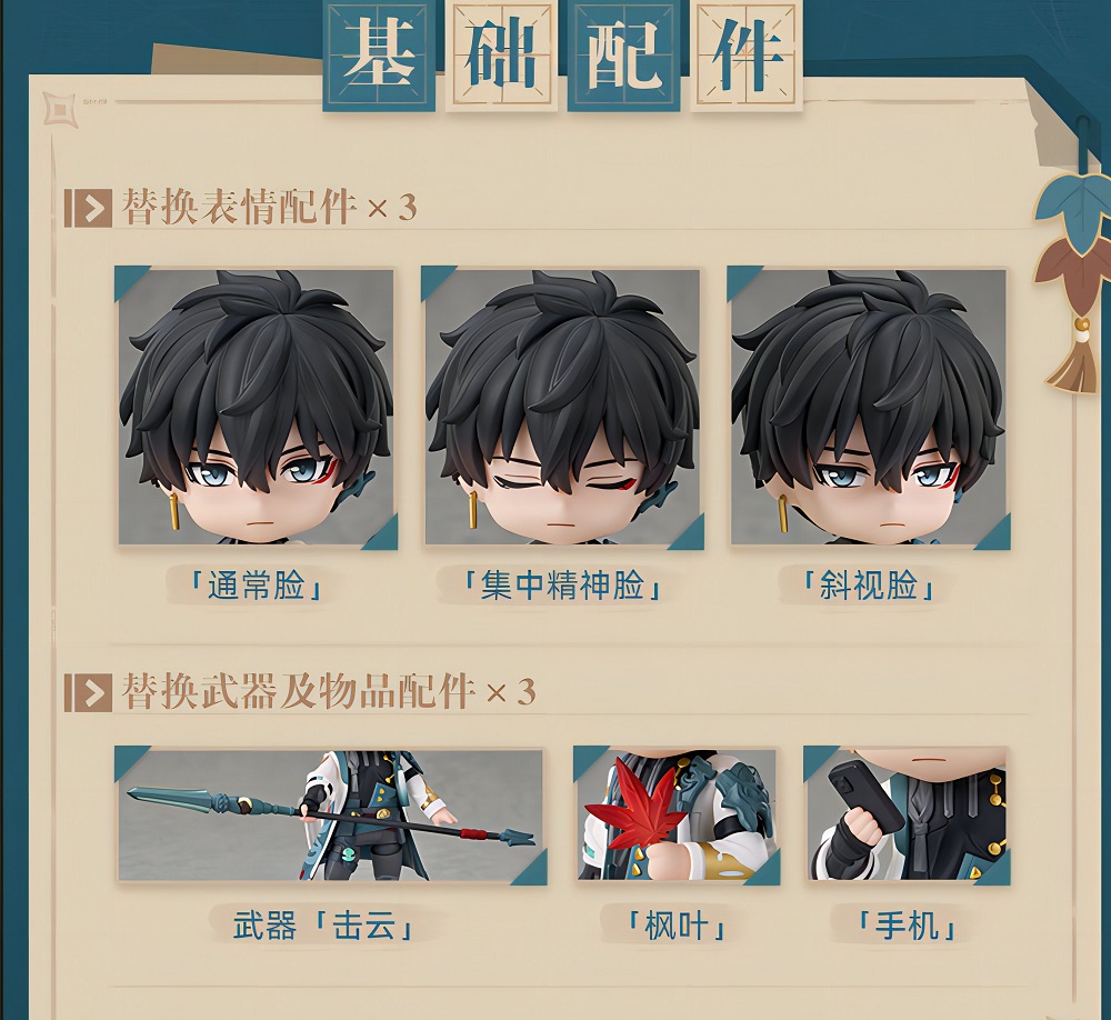 The Dan Heng Nendoroid will come with three face plates: a neutral expression, a concentrating expression, and a side-eyeing expression. You can combine the concentrating face plate with the Cloud-Piercer part to make it look like he’s about to use his Ultimate. Other optional parts included are a maple leaf and his cell phone. If you order from the miHoYo store, you can also get a free poster. The artwork uses one of the promotional images for Honkai: Star Rail, which shows Dan Heng holding a cup of tea or wine while a full moon in the background looks like it’s dripping into it.