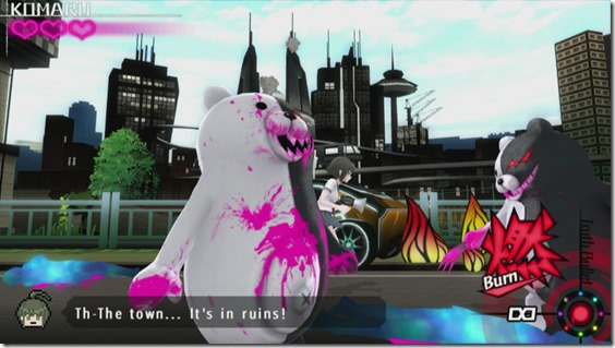 I found it more eerie to see Monokuma interacting in the real world than in the closed spaces of the previous games. In the original games, Monokuma’s executions were shocking at first but eventually became so outrageous they lost their shock value. However, watching Monokuma roam the streets and go on a murdering spree with pink blood galore brought a lot of that shock value back. As the army of Monokuma continue on their murdering spree, Komaru is eventually targeted and is forced to run and hide for her life. Eventually, she is greeted by a familiar face to returning players and is given a hacking gun that can take out the Monokuma she is facing.