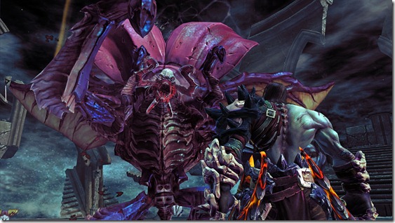 However, there’s more to Darksiders II than just combat, as much fun as it is. The closest analogue to the game’s structure is Zelda, since you’re tossed into a giant overworld with a number of dungeons to explore (using “skeleton keys” to open improbably large locks on doors). Given Darksiders’ focus on combat over gadgets, however, the game doesn’t quite fit the Zelda mold. Instead of finding the right way to use a new item, like in Zelda, a lot of the challenge in Darksiders is traversal, in or out of dungeons. You see, while there are dungeons that you have to play through to continue the story, there are also a number of smaller dungeons and little nooks and crannies to explore. Death can run up and along walls, swim perpetually (I guess you don’t need to breathe when you’re the grim reaper), and do all sorts of acrobatics to get where he needs to go. While the game has some visual cues to show you how you can progress (scratch marks on walls Death can run along, for instance), traversing terrain effectively feels nice and usually results in a great reward. What reward is that, you ask? Why, loot, of course! Food for Thought: 1. Death is a fantastic character. Not as much in the way he’s written as the way he’s voiced. He’s cynical and sarcastic, but not whiny. He cares about his brother War (who he’s trying to save by reviving humanity), but isn’t so focused on his mission that he’s become humorless. I’m particularly fond of the way he kind of mocks the player when they try to pick up a potion when they’re overloaded by chuckling “impossible.” 2. While I like Death, I can’t shake the feeling that he looks like the lovechild of Skeletor and Jackie Estacado from The Darkness. 3. The sidequests I’ve played thus far have been refreshingly free of the “kill 25 so-and-so” style of questing, Instead, they’ve led me into new dungeons and pitted me against hidden bosses. 4. I highly recommend playing the game on its harder “Apocalypse” difficulty to get the most out of the combat. It’s not too hard, but it gives the game an extra little bit of challenge that forces you to learn how to fight better. (It’s also pretty forgiving with checkpoints)