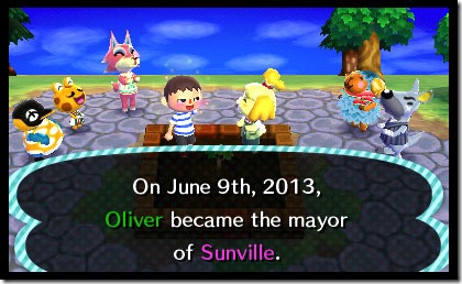 Oh Animal Crossing, I’ve missed you so. Even Tom Nook is a welcome, friendly face. Okay, maybe that’s taking a bit too far, but still. It’s wonderful to step back into a small, happy, virtual town. My life in Animal Crossing: New Leaf began with a train ride with a familiar blue cat named Rover. Rover enthusiastically welcomed me into the world, mentioning how he’s been riding the rails since 2002. As always, a series of short questions determined my character’s starting look, as well as a chance to pick a layout for the humble hamlet of Crawford. Upon my arrival, I was met with a very merry welcome. A perky puppy, perhaps a Lhasa Apso, Astrid the kangaroo, Chester the Panda and Coach the… emu(?) were there to welcome me to town. Despite my protests, I was unanimously named the mayor. They said my being a human would actually be an asset, as it would provide a fresh viewpoint of town. There was also a moving ceremony involving planting a tree. It was quite touching.