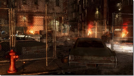 A stage set in a back alley, surrounded by a steel fence and brick walls. It feels dangerous, but seems like a popular hangout spot. Danger Zones