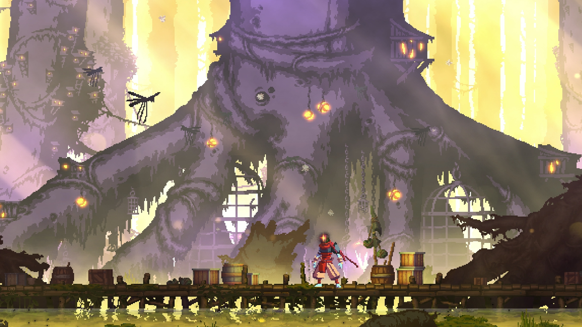Each of The Bad Seed’s new areas will offer new challenges in Dead Cells. New monsters will be available in both, and The Swamp will even have a Heart of the Swamp area with a resident “mama” tick to defeat. (The Steam listing describes it as being reminiscent of StarShip Troopers.) Among the new weapons are a scythe.