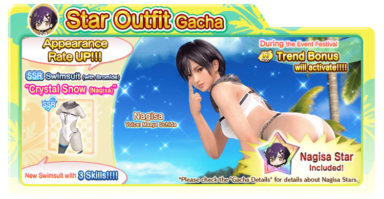 Players can grab Nagisa’s exclusive Swimsuit “Crystal Snow (Nagisa)” during the time-limited gacha from now through June 9, 2020 at 6:59 UTC. A commemorative login bonus will also be available during this period with 14 days of rewards. Dead or Alive Xtreme: Venus Vacation is available for PC in Japan and Asia. The Japanese version of the game recently added the playful and energetic girl Patty who is from the nearby islands.