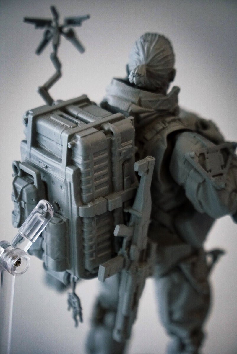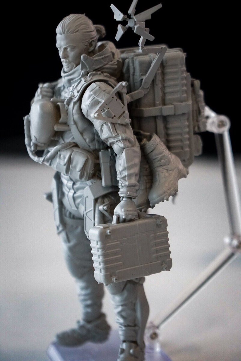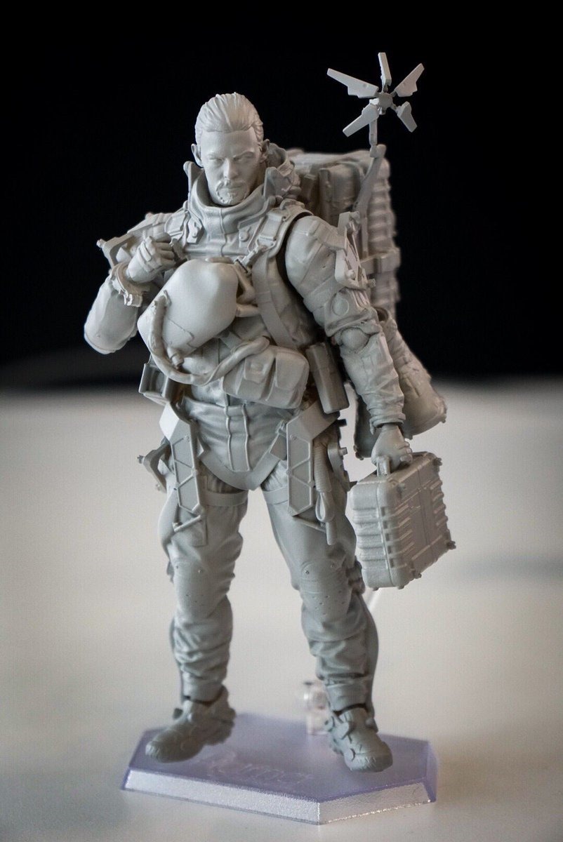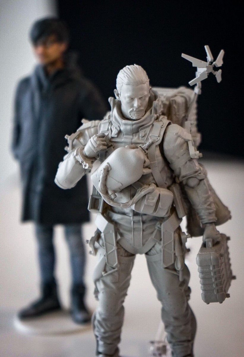 While no more definitive information on Death Stranding has been released, Hideo Kojima took to Twitter to show off a prototype Death Stranding figure. He noted that it is a figma of Sam Bridges, the game’s hero, who is working as a courier of some sort. Its details allow us a better look at Sam and the equipment he will be using. In a second tweet, he specifically called attention to the gear on Sam’s back. The Death Stranding figma has Sam in his suit and greatly resembles Norman Reedus, who participated in the motion capture and provided the English voice acting for the character. He has the same outfit and equipment as Sam did in his Tokyo Game Show 2018 concept art and trailer. He is carrying the suitcase parcel in his left hand, the detector arm is deployed on his left shoulder, and he has a number of similar containers strapped onto his back. We also see that he carries a second pair of boots and has a gun strapped to the right side of his back. He also wears protective kneepads, though this prototype does not have him wearing the helmet that sometimes appears in some trailers. Here are all of the prototype Death Stranding figma images Kojima shared. In one picture, a Kojima figurine can be seen in the background.