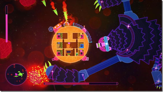 It’s a game in which you and a partner attempt to defend a neon pink battleship by running around its various stations to shoot weapons, maneuver it, and restore shields. The challenge is being everywhere at once or, at least, being where you need to be at the critical moment.