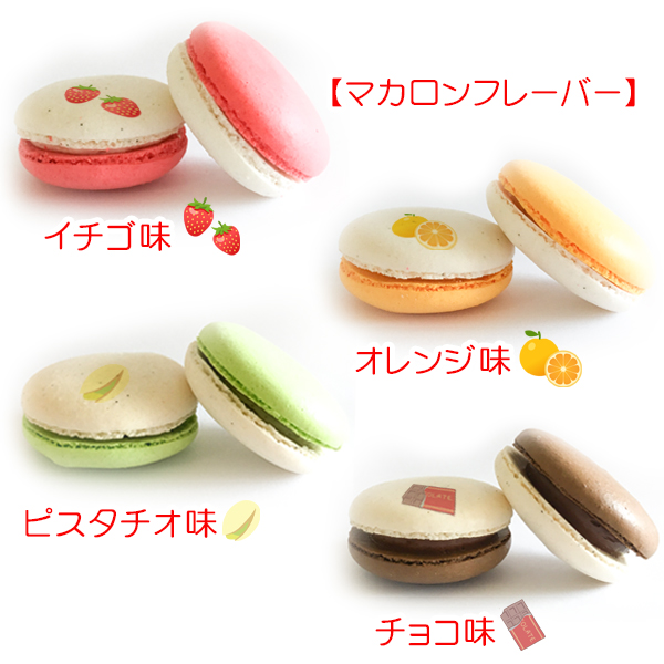 The macarons come in options of three sets featuring different characters. Each set comes with six macarons. The possible flavors include strawberry, orange, pistachio, and chocolate. The