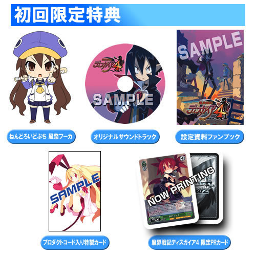 A run of the mill limited edition includes Disgaea 4, an artbook, soundtrack CD, card with a code to download Flonne, two Disgaea themed trading cards for Weiß Schwarz, and a Fuka nendoroid.