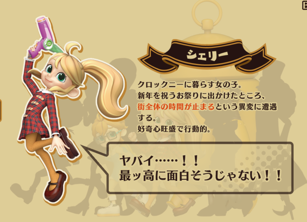 A girl who lives in Clockney. During the New Year celebrations, she encountered the strange occurrence of time stopping in the town. She’s always curious and very proactive.
